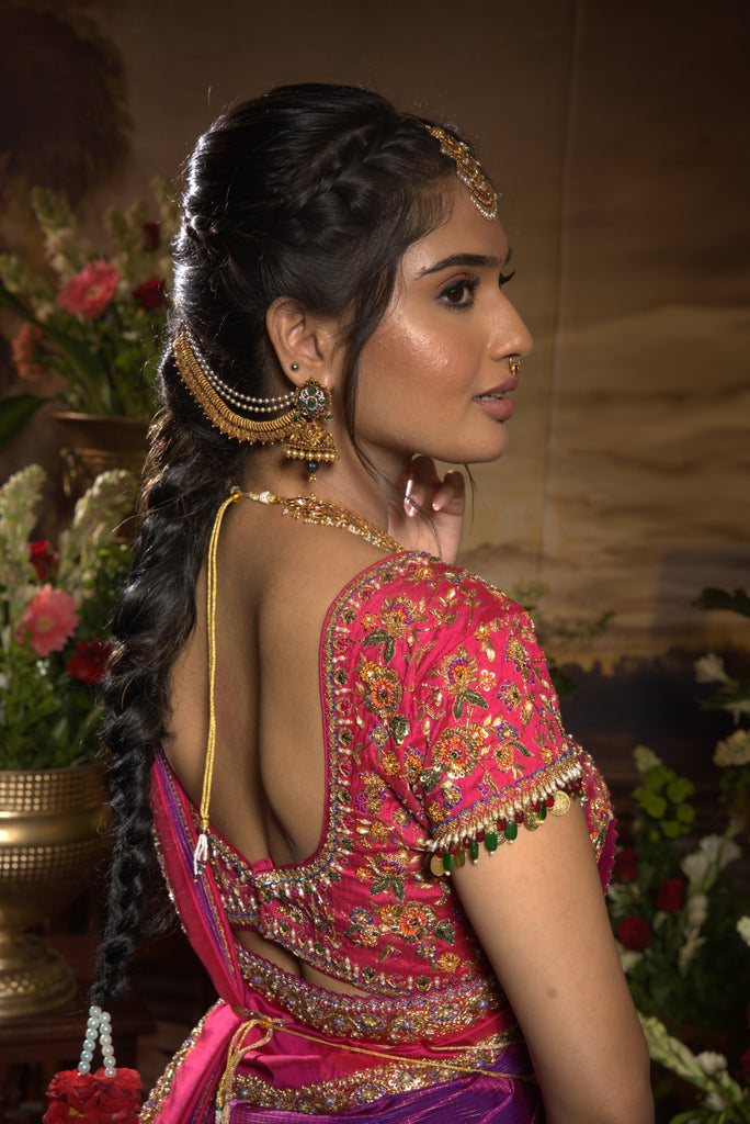 Draped in the timeless beauty of magenta and royal pink Pure Kancheepuram silk, this classic saree is elevated with intricate double-border embroidery with blouse wok in rich rawsilk celebrating heritage, craftsmanship, and bridal grace in every weave.
