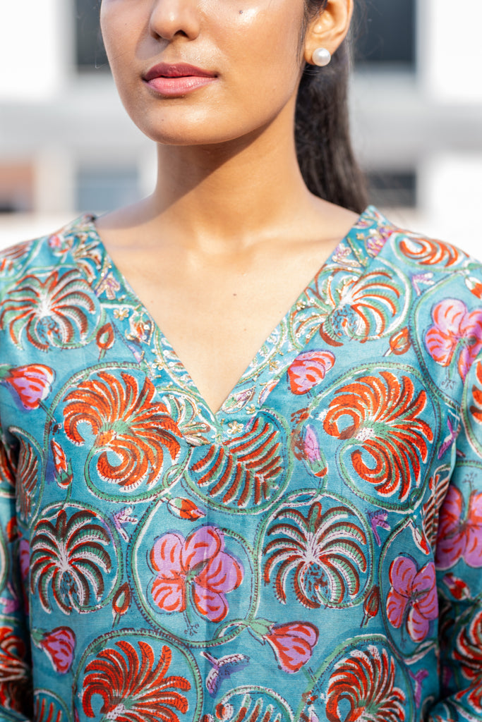 This pure Chanderi silk dress in blue showcases elegant pink floral prints, an overlapped V-neck with delicate embroidery, and embroidered sleeve cuffs, paired with dyed Assam silk straight pants for a graceful, sophisticated look.