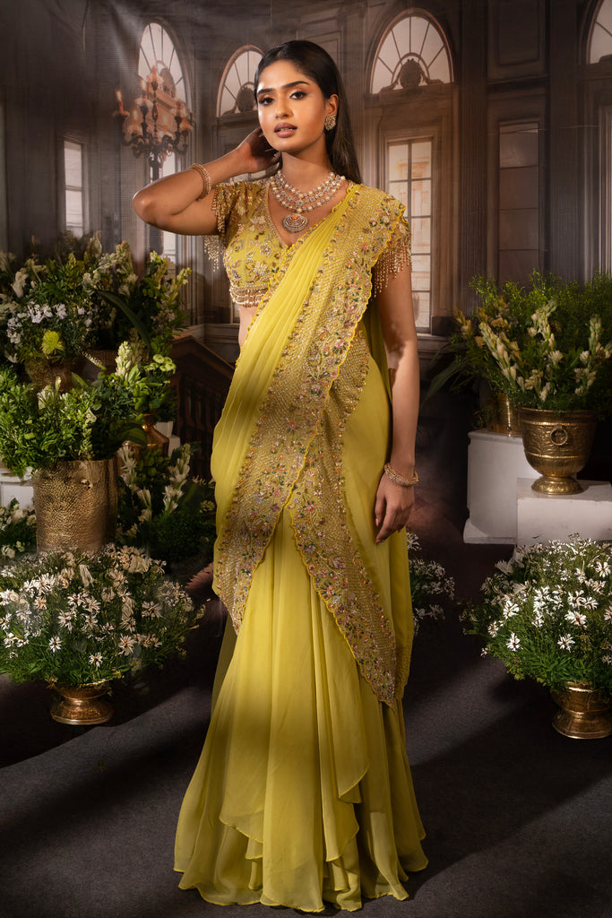 A lime-yellow organza ensemble with a patterned skirt, paired with an intricately embroidered shawl and a delicately embellished blouse — lightweight, graceful, and perfect for a vibrant sangeet celebration.