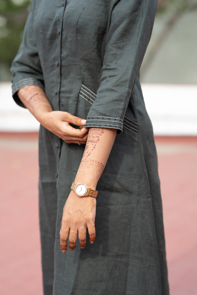 This pure linen dress in olive green features a slope V-neckline with fabric buttons, subtly highlighted sleeves and pockets, offering a perfect blend of minimal elegance and everyday comfort.