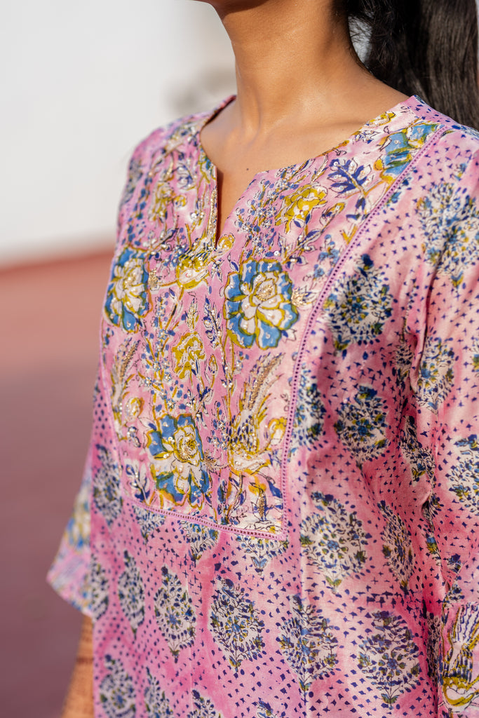 This pure Chanderi silk dress in soft pink features pink and blue floral prints, a crew V-neck with lace and  yoke embroidery, and embroidered sleeve cuffs, paired with semi-palazzo pants dyed in Assam silk with delicate bottom embroidery for a refined, elegant finish.