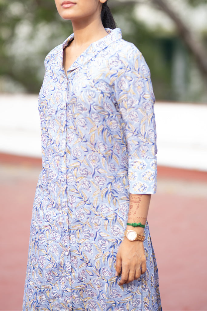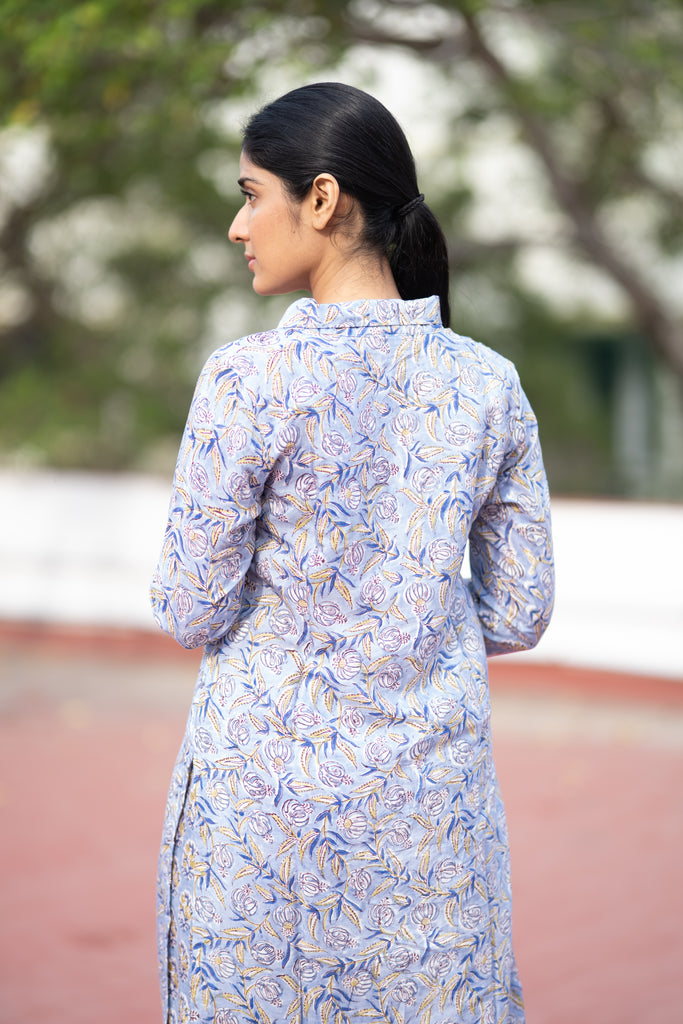 This pure Assam silk dress in ice blue features delicate floral prints, a roll collar with a V-neckline, and is paired with elegant palazzo pants for a refined and timeless look perfect for casual and formals.