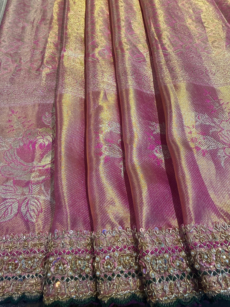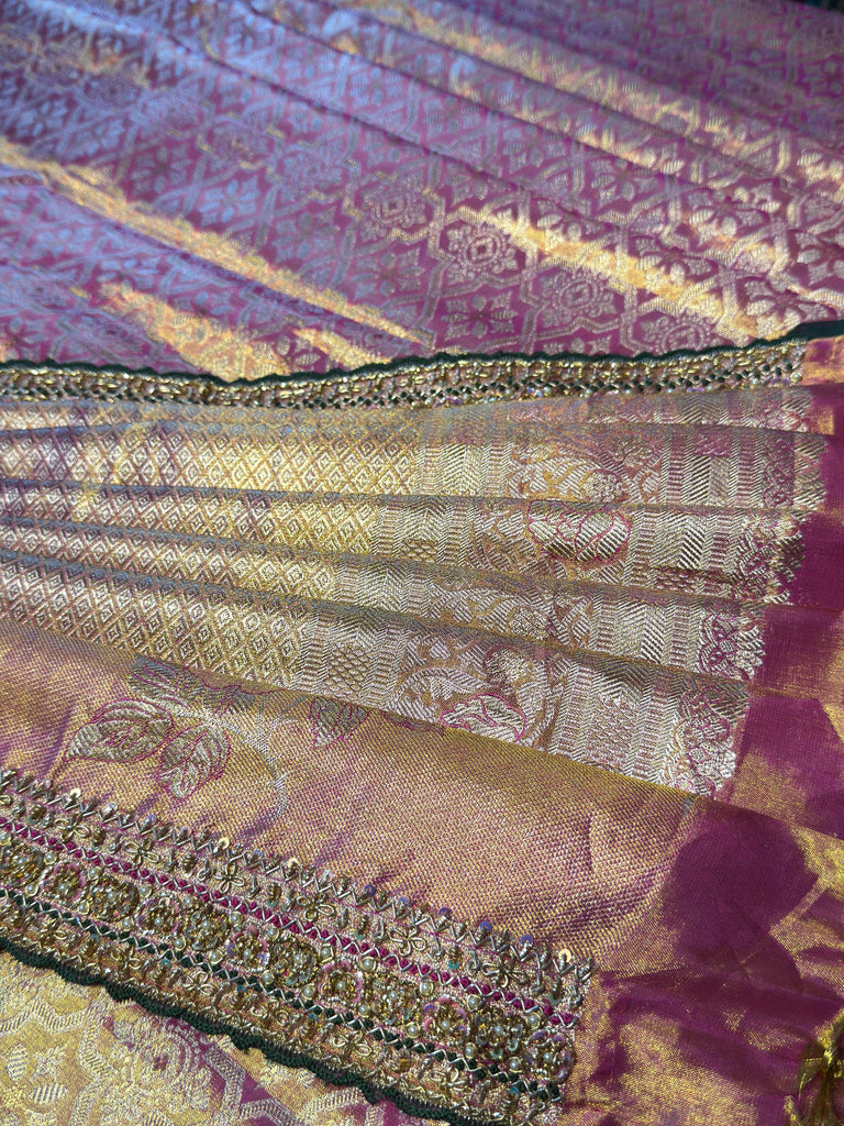 A luminous rose pink Kanchee tissue silk saree, enriched with antique gold sheen and intricate traditional weaves—crafted for the bride who embraces heritage with timeless grace on her special day.
