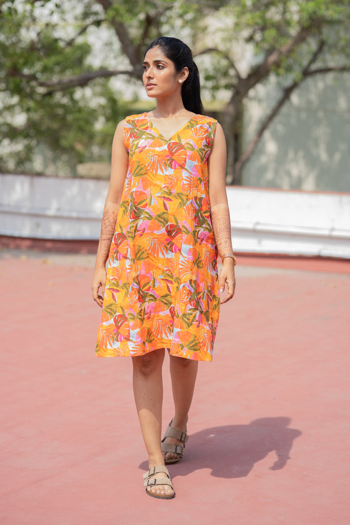 This dress is a vibrant, sleeveless knee-length piece featuring a colorful tropical print with shades of orange, red, yellow, and green. It has a V- neckline. The light, breathable fabric and playful print make it ideal for summer or casual outings.