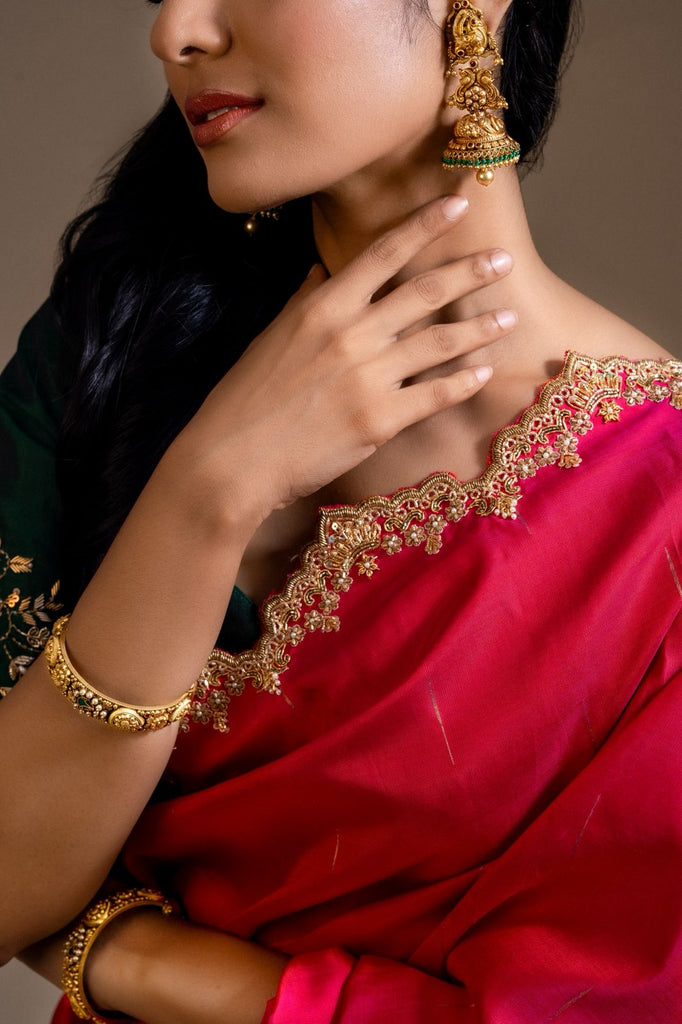 Elevate your elegance with our Pink Kanjeevaram silk saree, featuring exquisite border hand embroidery and a statement pure silk blouse that embodies timeless beauty and craftsmanship.